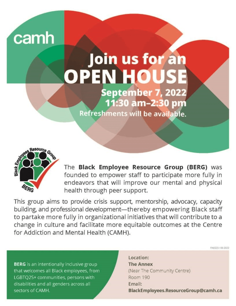 Join the CAMH Black Employees Resource Group (BERG) for an open house September 7, 2022, 1:30 am – 2:30 pm.