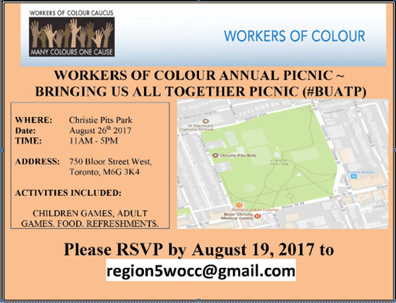 This Saturday, the Workers of Colour are holding their annual picnic. They would love for you to come out and join them. There will be games for the children, games for the adults, food and refreshments. Please not if you will be attending, please bring a lawn chair or blanket to sit on as there is a limited number of picnic tables at the park.