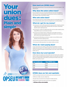 The brochure also includes a chart that explains the OPSEU dues structure.