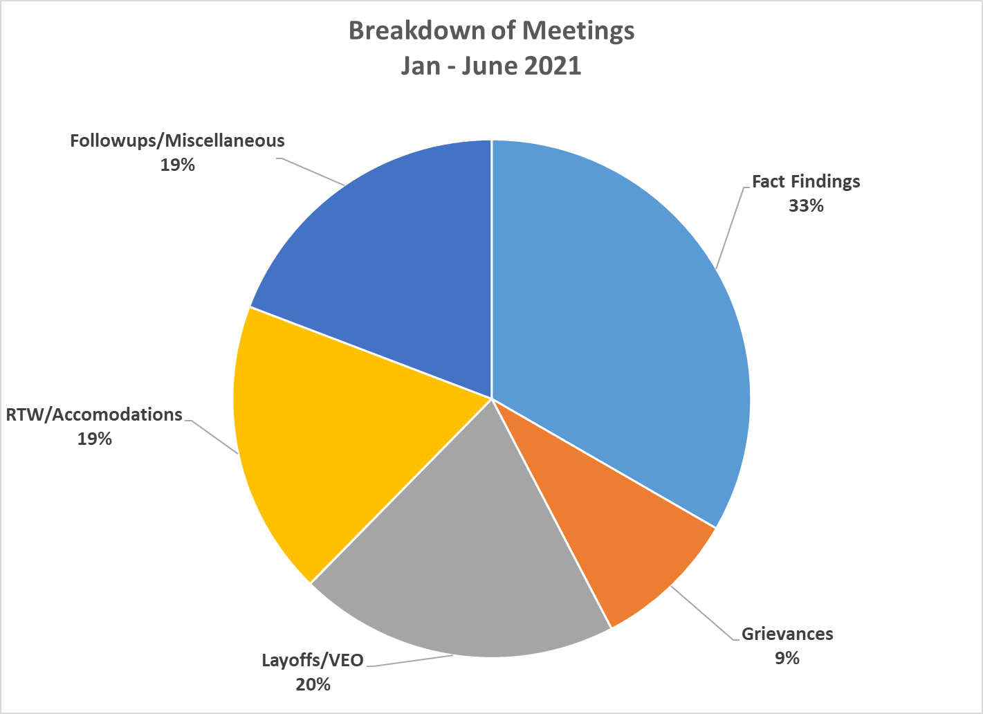 4. Follow-ups/Miscellaneous (19%): Includes all other meetings related to members including completing investigations, committee meetings (Joint Health and Safety Committee, Horizontal Violence Anti-Racism Anti-Oppression Committee, Labour Management Relations meetings, Recruitment and Retention meetings, Leave of Absence meetings etc.)
