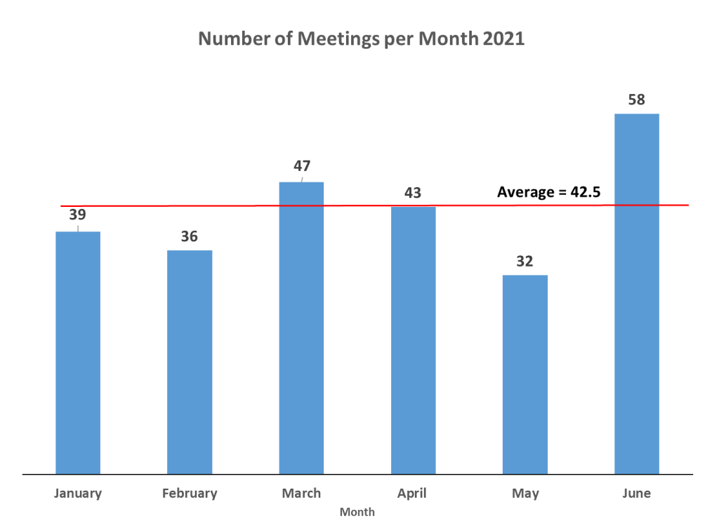 The Local participated in 255 meetings from January to June 2021. The meetings were further categorized (in order of highest to lowest percentage) as